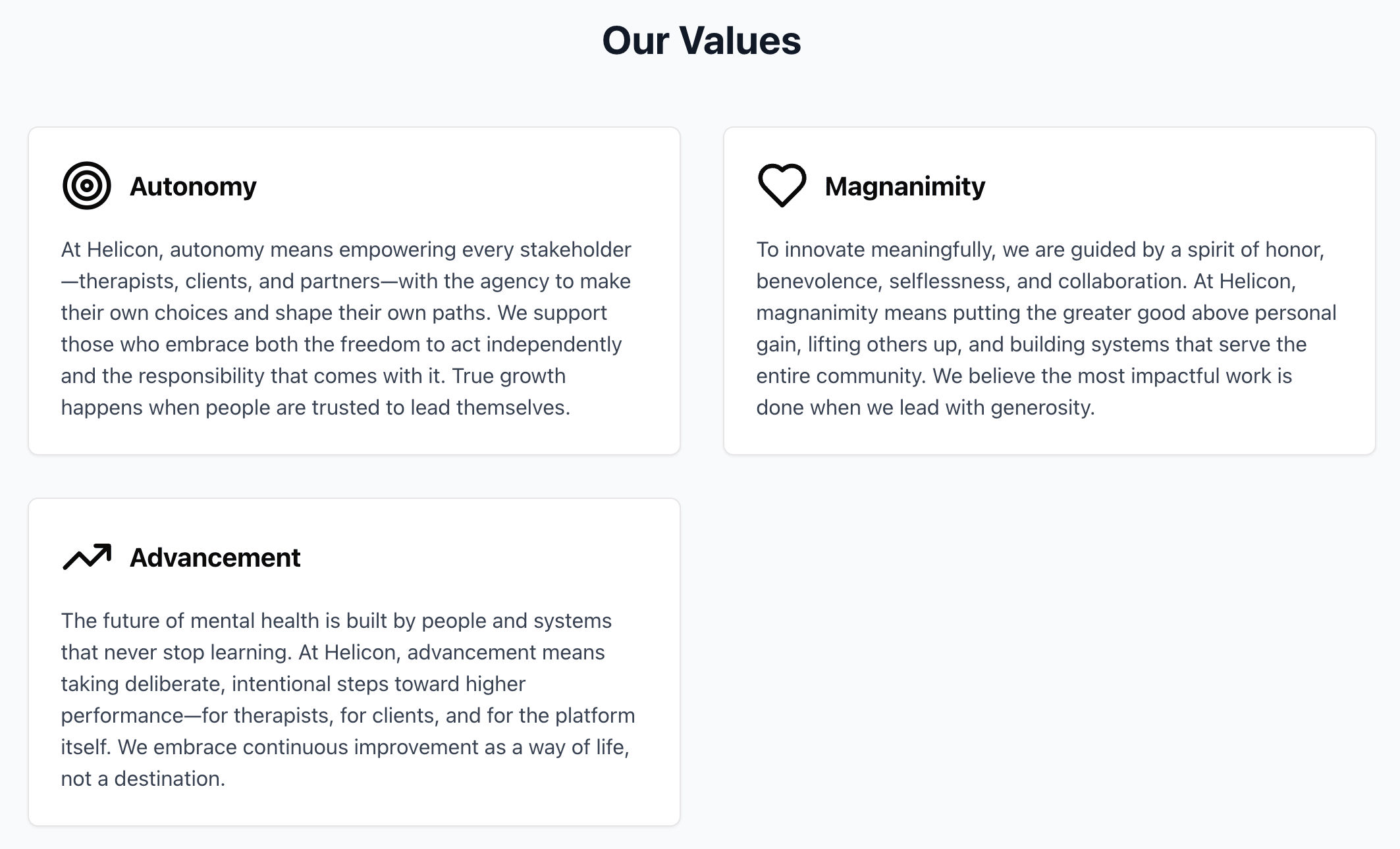 Psst… stay tuned for future articles and a guide about how to transition from an agency setting into private practice! Final ThoughtsThe research behind therapist-centered care models validates what you already know from experience: Sustainable, effective practice requires protecting your capacity to show up fully present. Whereas industrialized models that treat this capacity as an infinite resource does nothing but send burnout rates through the roof… which some studies now place as high as 67% among clinicians. So yes, therapist-centered care is supported by evidence. It clearly is. The question is what structures you’ll build or join to protect your capacity to serve your clients in the most effective way possible. That’s what Helicon is all about. We're building an ecosystem for EMDR therapists who want to not only "survive," but more than that, thrive on a platform where you can grow as a therapist, join a supportive community, and potentially find more aligned clients, too. We have been intentional about reflecting that in our stated values: I hope you’ll join us. A better system is possible, and it starts with therapists linking arms to build it together. Just this past week we opened up the platform to early testers - all EMDR clinicians who are excited to help build this into something meaningful! Until next time, Chris Thanks for reading Helicon's EMDR Therapist Weekly, where we aim to provide a weekly dose of insights, tools, and opportunities for EMDR therapists; designed to support your growth, sharpen your practice, and connect you with what's next. If you're not already subscribed, subscribe here. You can also click here to learn about what Helicon is building, or apply to join our pilot if you're an EMDR provider and want to connect with others on the same path. Disclaimer: The information contained in this article is for informational purposes only. This is not legal or clinical advice and we make no guarantees about the outcomes or results from information shared in this document. Proceed at your own risk and discretion. |